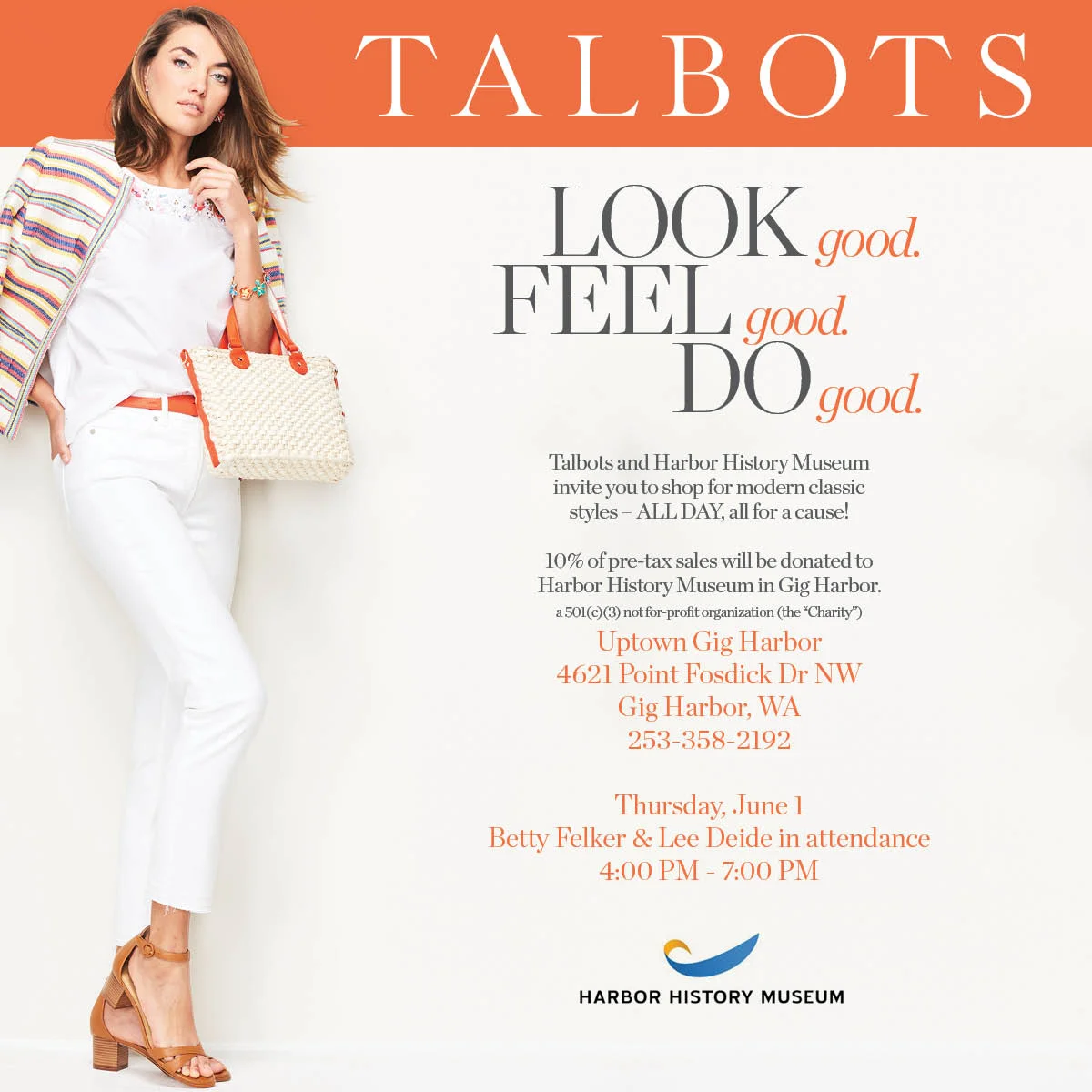 The Harbor History Museum has partnered with Talbots in Uptown Gig Harbor for a special one-day event. On Thursday, June 1st, 10% of Talbot's pre-tax sales will be donated to the Harbor History Museum.